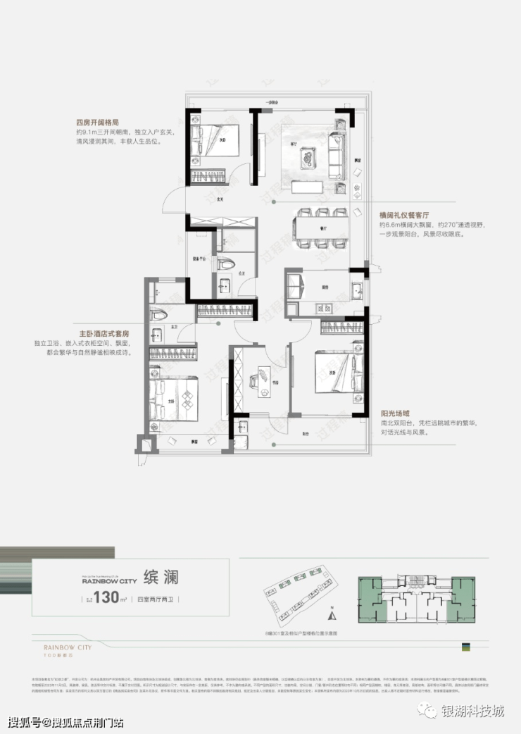 整盘共规划有11幢高层住宅,北地块712户,南地块236户,1期(北地块)3个户型,规划建面约96-130㎡都会综合体住品,最小约96㎡三室两厅两卫、其次约115㎡四室两厅两卫,最大约130㎡四房两厅两卫,精装限价2.13万/㎡(含3000元/㎡装修),含中央空调、主卧智能马桶、地暖(厨房、卫生间无)、洗碗机、客厅电视背景墙、墙布等精装一步到位,首置即改善。