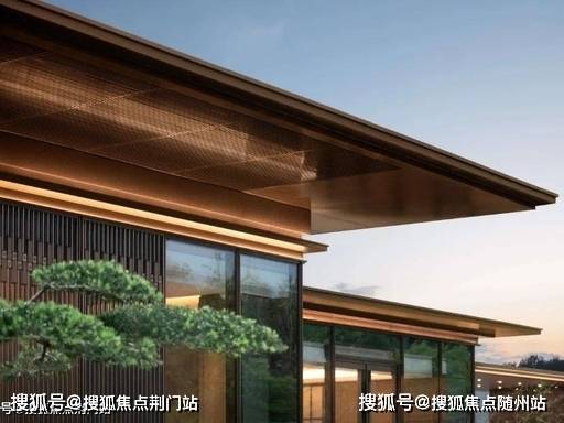 铝板 + 天然石材 + 三玻两腔玻璃,现代东方美学,暖银色主调,横向金色线条点缀。
