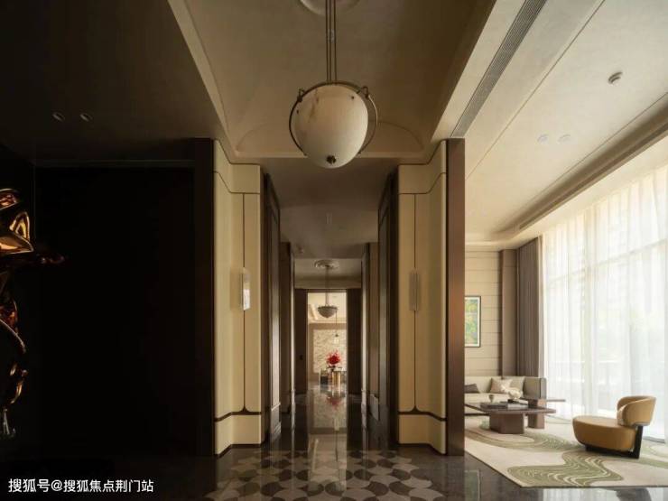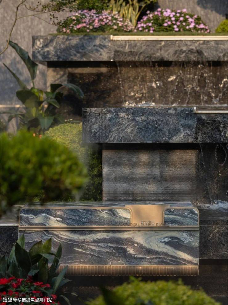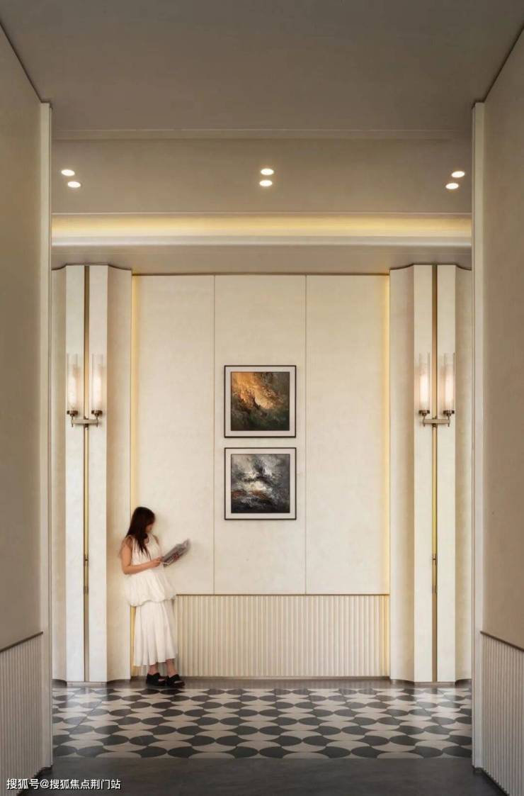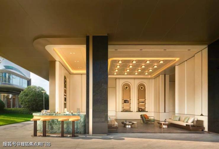 时舟里大门气势恢弘,利用地上架空车库的做法,打造了约9米高的双层高大门,鎏金天幕铺开,横向70米宽的尺度让入口的空间气场拉满。