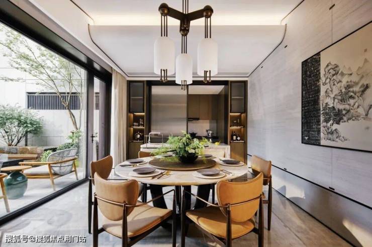桃木色铝板复刻古木纹理,搭配大面积落地窗,既还原中式窗棂的通透,宽幅的开窗面又让山景、院景一无窒碍地涌入室内。