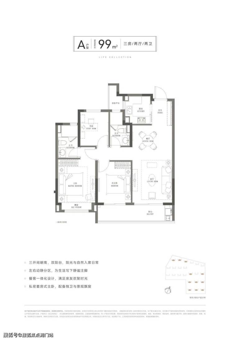 约99㎡三房两卫,是经典的三开间南格局。不仅设计了 约6.35米的双开间长阳台、U型厨房台面等小户型里较少见的配置,还预留宽裕的玄关柜空间。