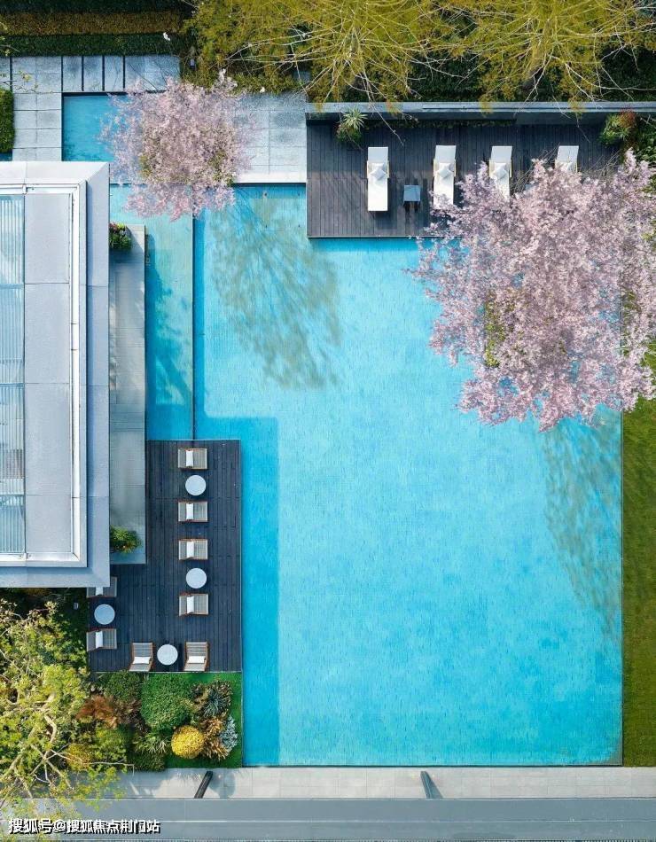 活力剧场里设计了湛蓝的景观戏水池,水岸布置茶几休闲躺椅、还种上了一大一小两株樱花树,度假感直接拉满。
