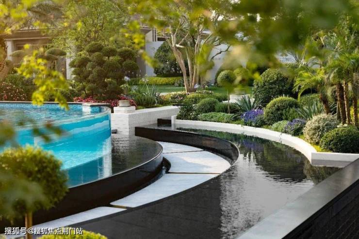 景观轴上,约280㎡的无界泳池,灵感来自希腊安缦酒店,是“浮屿花园”的画眼。