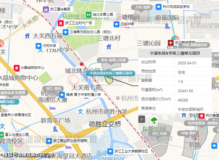 2025年4月初,宁波东投以总价15亿元竞得三塘单元的杭政储出[2025]28号地块,折合楼面价46268元/㎡,溢价率约54%,项目名为“武御林宸院”