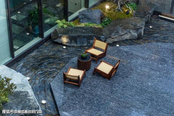 主动退让了十多米的门楼,拉开几十米的恢弘尺度,流水、叠石、罗汉松,加上太行山的60吨自然老石皮背景墙,组成重檐深院下的豪门气场。