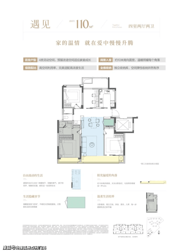 1)110㎡做到四房两卫+储物间,得房率较高,实用性强