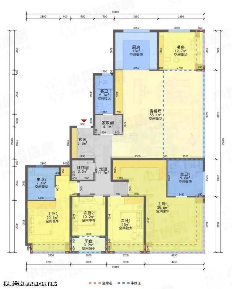 这个户型其实槽点不太多,一定要说的话,南向次主卧卫生间的采光应该会偏暗,另外3个多方的生活阳台,只能说够用,如果不是因为有独立家政间的话,这个阳台在这个面积段,就不太够用了。