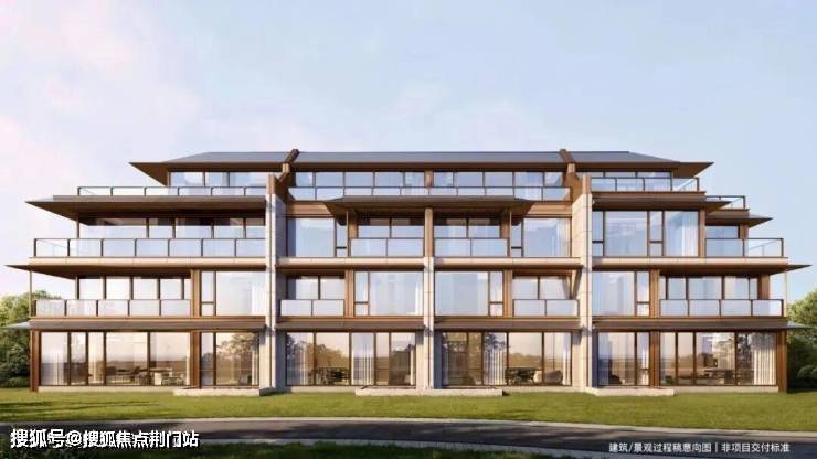 建筑立面,整体延续鸣湖里的设计语言,以大面low-E玻璃、香槟金铝板、暖白色石材搭配灰色金属铝板线条勾勒,更融入时尚元素,打造出潮奢宋韵纯低密住区。
