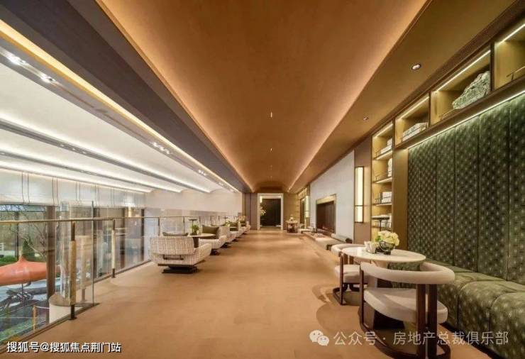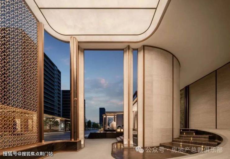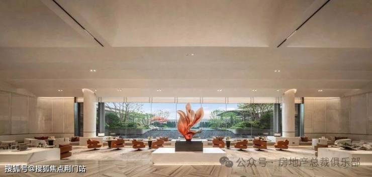 构筑约1200平方米的八大主题会客厅,与下沉式庭院无缝对接,打造无界限的融合体验。地上会客厅大堂前场汲取迪拜 THE LANA 酒店的设计灵感匠心独运,打造流畅圆弧形书页式吊顶“无界之镜”超大落地玻璃,构筑全景观景盒子内外景观浑然一体,曼妙风光徐徐映入眼帘。