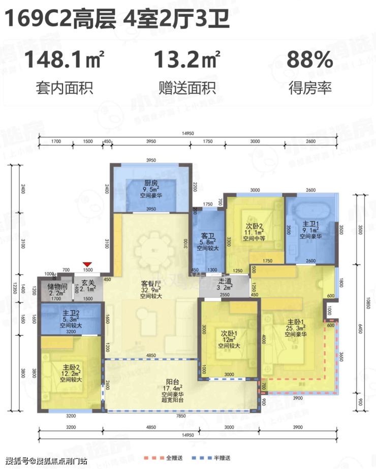 建面约169㎡C1-C2四室两厅三卫户型: