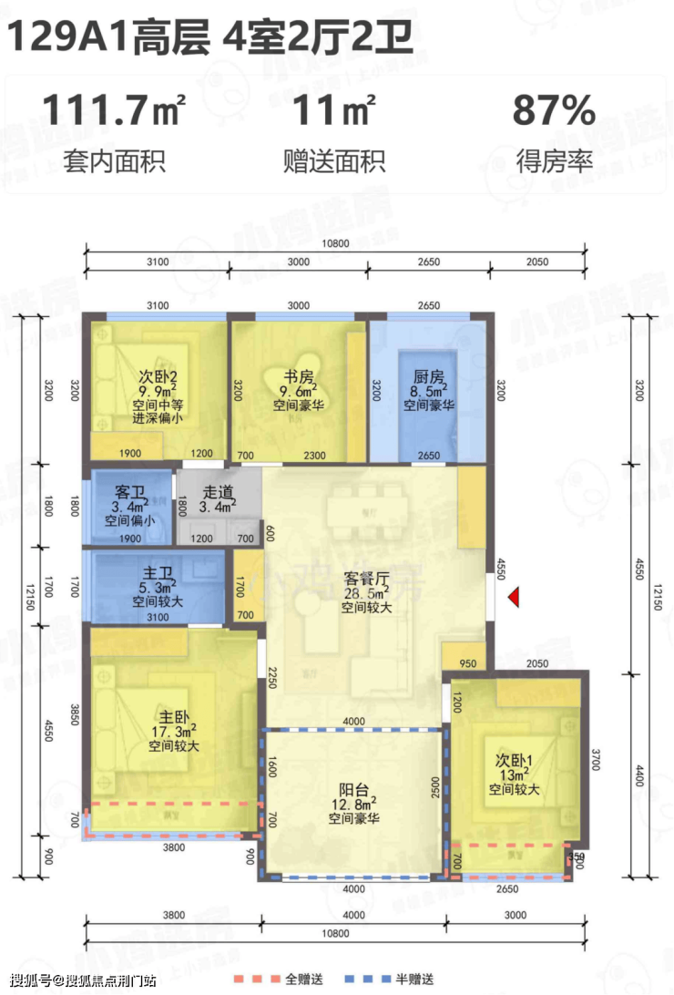 建面约129㎡A1-A2四室两厅两卫户型: