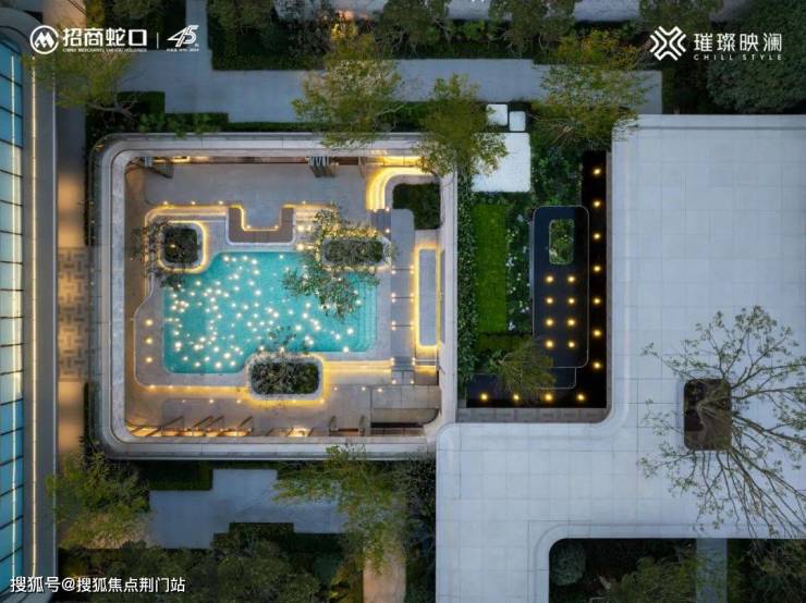 马尔代夫的深邃:还是下沉式庭院,卡拉卡白石材马赛克包裹的戏水池,在夜色下状如星河闪耀,三棵源于地中海的“万木之王”银叶油橄榄树点缀其中,更有层级式的叠水,休闲卡座,让身临其境地体验海岛度假般的松弛和自在。