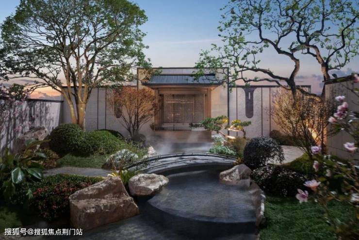 云启玉渚师法良渚高台形制和玉琮美学,熔炼九大细节,铸一座约68米宽(含景墙)的归家门庭——「玉阙九仪」。屋檐取形太和殿庑殿顶,两侧铜狮镇守、五步青云阶递进,涌泉灵动,琮黄色调沉稳铺陈。这不仅是归家的仪式,更是家族门风的当代写照,从第一眼即奠定东方礼序与不凡气场。