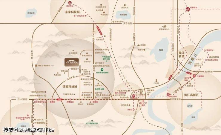 项目位于银湖科技城融杭门户,抢占交通资源高地,约1500米连接杭州地铁6号线虎啸杏站,瞬达杭州主城核芯。毗邻G320国道与彩虹快速路西延段,形成快速融杭交通走廊。