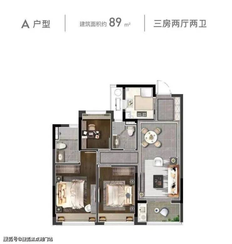 该户型为项目的中间套户型。三开间朝南,采光好!餐客厅一体带南向阳台,晾晒方便,主卧为套房设计带独立卫生间