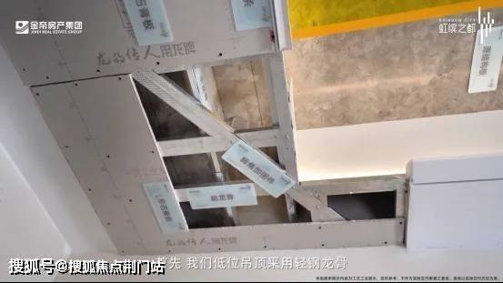 再比如,为打造更加稳固美观的吊顶,低位吊顶采用轻钢龙骨,转角处最容易变形的部位设置斜拉龙骨,增加骨架稳定性。轻钢龙骨工艺比传统木龙骨、木工板挂板工艺,具有自重轻、防火性能高,更环保、更坚韧等优点。