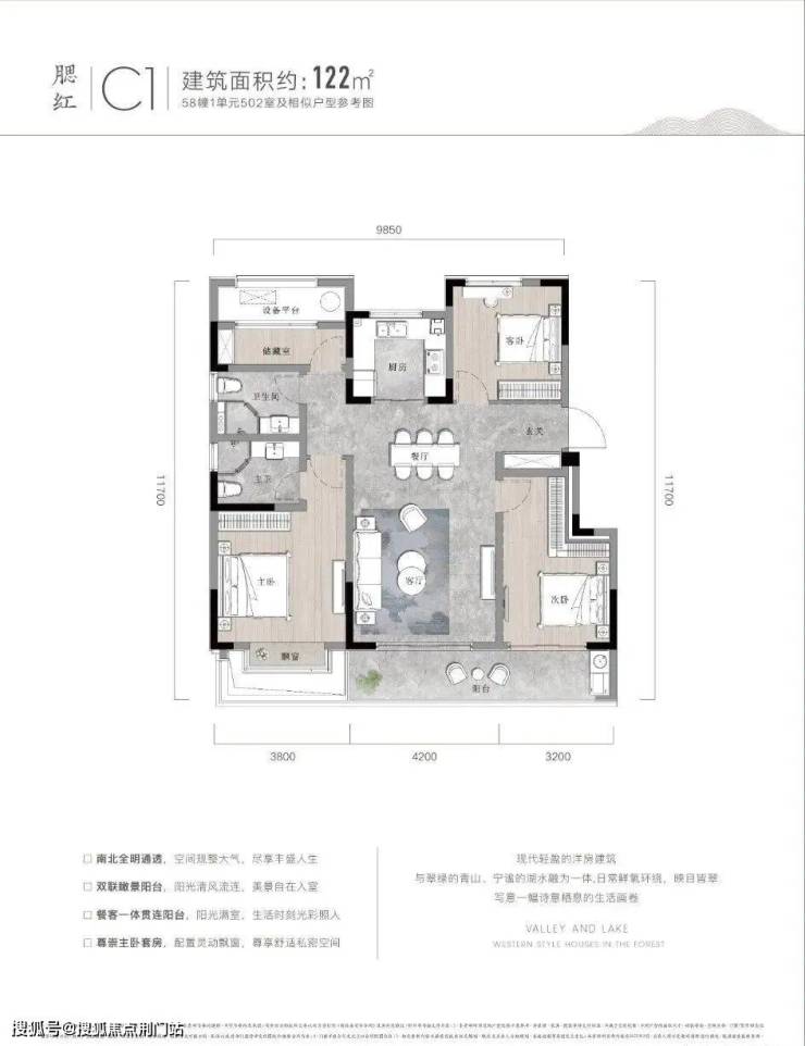 户型点评优势:122㎡的三房两厅两卫设计,留出了独立的玄关收纳空间与落尘区,十分贴心。三个房间分布在三个方向,空间都不显局促,主卧更是自成一体。客厅连阳台,一动一静之间景观尽收眼底。