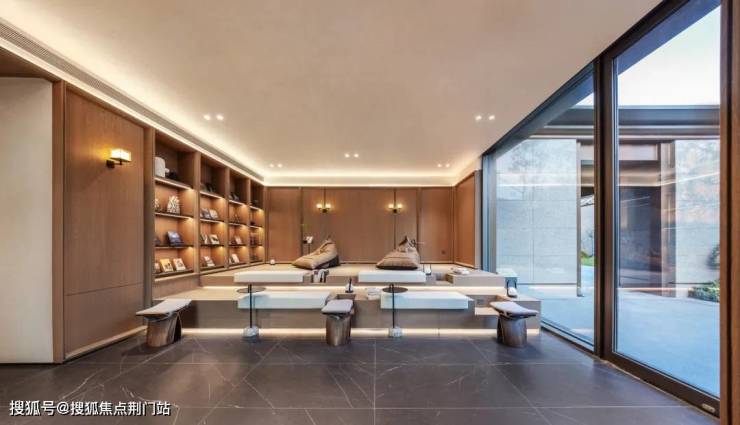 再往前走,“林泉曲院”里,一座五折连桥涉水而过,诗意的廊亭水榭,回环曲折,通向镂刻祥云纹的电动门——门后便是最后一站“山水雅庭”。变身为业主待客、休憩、观景的“云缦阁”,首次采用传统的抬梁式结构,通体落地玻璃,业主在里面品茶待客,卸去一天的疲惫。