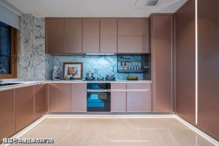 还有厨房里的收纳柜,敲一敲,柜门自动弹开。想象一下,在做饭时,手上沾满油烟料汁,去打开传统的柜门,把手处最容易藏污纳垢。但是这种用手背敲一敲的设计,就省心了。