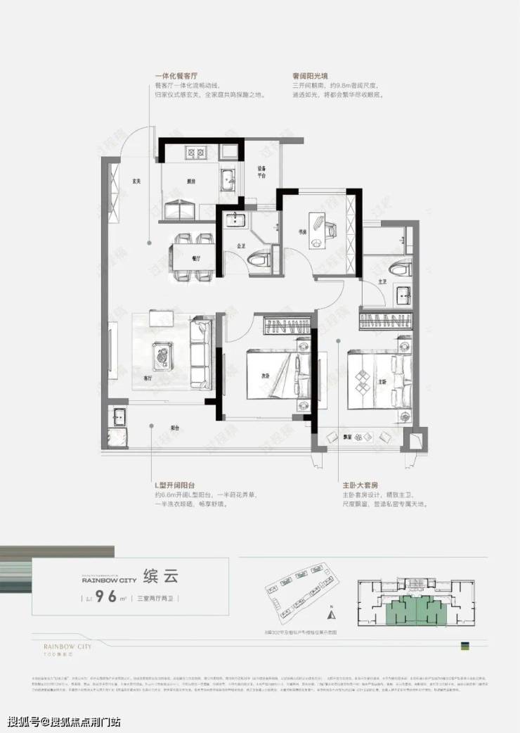 96㎡三房两卫: 6.6米L型双联阳台:一半养花喝茶,一半洗衣晾晒,阳光从早晒到晚;