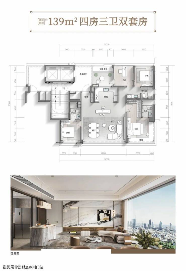 保亿君潮润府139㎡4房3卫户型做到四室三卫的同时室内实际空间使用率高达97%,南向面宽约14米,客厅6.8米南向面宽;连接北侧的书房、北阳台、私家电梯厅,可形成一个可以植入更多生活场景的大洄游动线空间