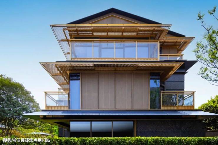 在立面打造上,樾青岚提炼飞檐、斗拱、引檐、直棂窗等宋代建筑细节,融揉现代审美工艺,重塑东方的当代表达;提取宋画中的线条感,通过局部铝线条的运用,融合巨幕灰蓝色玻璃,让建筑隐于自然,如画框一般,呈映天光云影。
