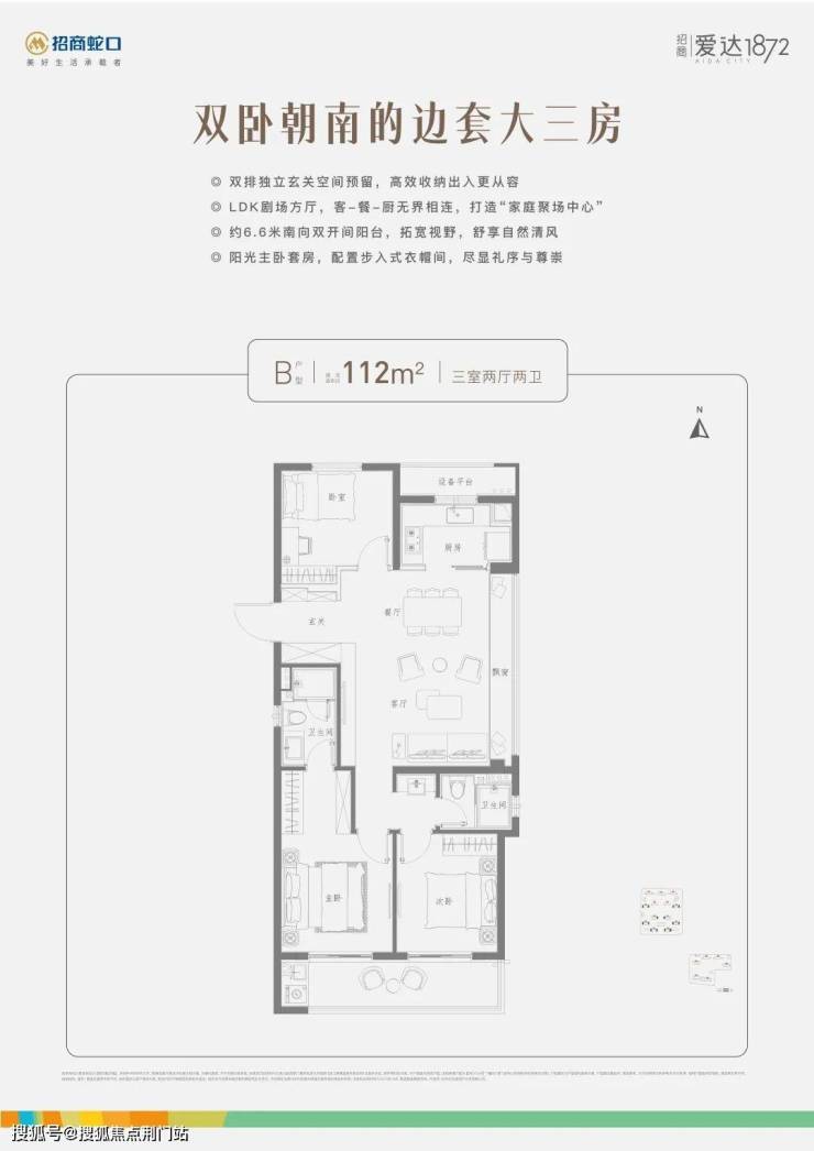 与常见的中间套户型不同,招商爱达1872的约106㎡,南向有3.5开间,面宽约有11.7米。如此一来,可以将更多南向开间面,留给餐客厅,同时外接约5.6米长的南阳台,让公区显得更为阔绰。