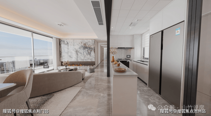 传统户型设计中,厨房往往较为封闭,忽视了当代家庭对社交、互动的需求。荷语江山府 143㎡奢阔户型,采用半开放式岛台厨房设计, 可通过 玻璃移门控制开合,打开门可随时与在客厅的家人互动,关上门则有效隔绝油烟。