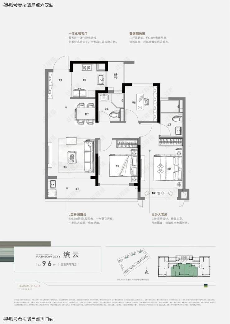 像建面约96㎡户型,整体三开间朝南设计,约9.8m奢阔尺度,户型方正大气,明亮通透,动静分区,再加上约6.6米开阔L型阳台,轻松实现一半洗衣晾晒、一般诗意生活的美妙画境。