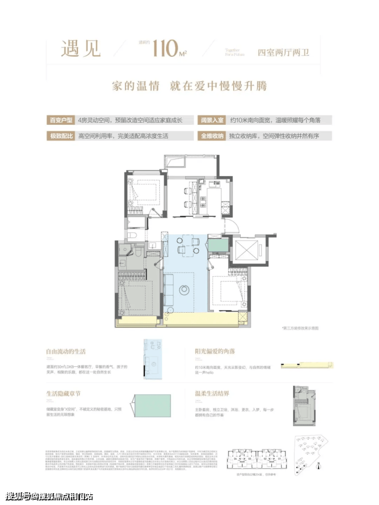 3.独立电梯厅+玄关+家政间+储物间+南向生活阳台+三卫配置,功能无死角