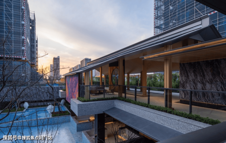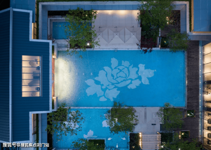 穿过大堂,眼前就是约380方的下沉式露天戏水池,分别设置标准戏水池、儿童浅水池、按摩池。沿岸设置水吧、卡座、树岛,设计融合新中式的瓦当流水,对标奢派度假酒店。