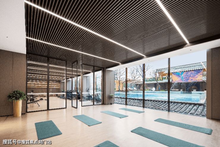 整个会所总面积近1000㎡,打破传统孤立的空间设置,将下沉式会所与戏水池、健身房、瑜伽房、更衣室、会客空间等功能间连通,形成社交情境交融的景象。