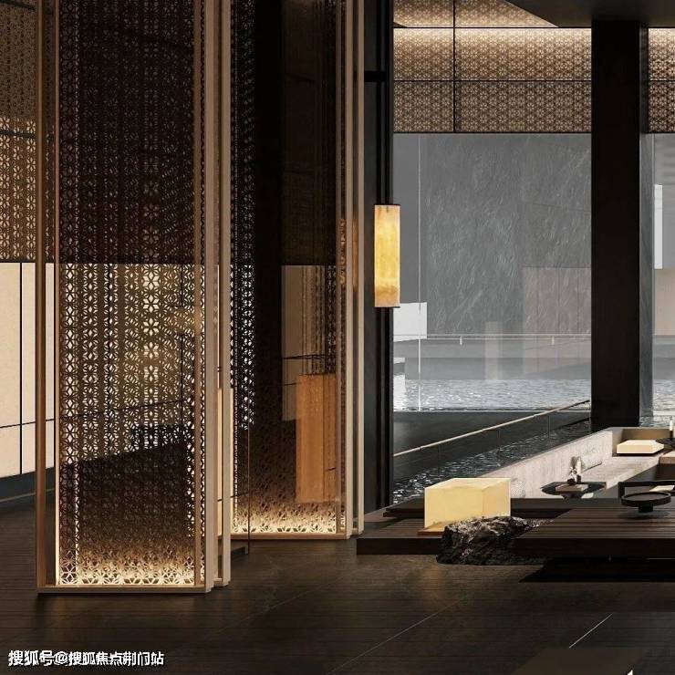 恒温泳池是会所的一大亮点,游泳体验更为宽阔、舒适;黑山石、梅花金属格栅等元素的植入,更是营造出自然汤泉的意境。