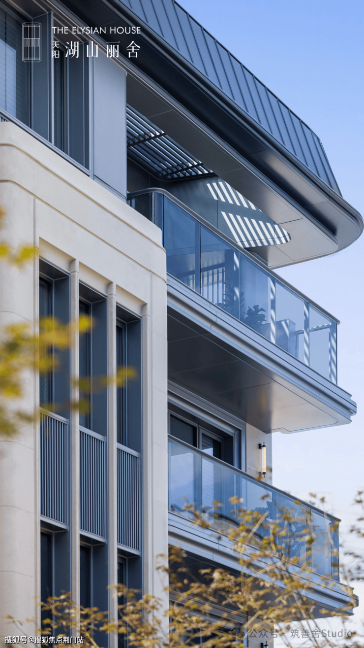 湖山丽舍巧妙运用暖色调石材与铝板的和谐拼接,精心复刻出自然与人工的和谐秩序。每一石面都经过细致雕琢,弧线流畅、倒角精致、线槽深邃,宛如将一首宏伟的交响乐转化为触手可及的立体雕塑。继而,以大量玻璃栏板和落地窗的巧妙搭配,以及阵列式长窗的独特设计,为建筑注入了无限灵动与通透之美,完美契合现代审美的潮流与生活的舒适需求。