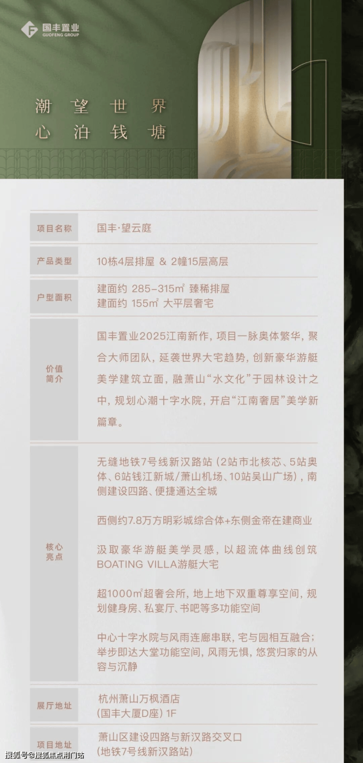 本宣传资料属于要约邀请,不作为要约或承诺,资料中对项目周边环境、交通/公共设施、政府规划、商业配套、教育资源、发展/投资前景、区位等的展示或介绍,旨在提供相关信息供参考,开发商对此不做任何承诺。效果图仅为本项目建设区域设计效果及周边区域的效果图过程示意,因图像技术、比例所限,与实际存在一定差异,部分建筑、设施、景观等信息无法完全准确展示,外立面颜色、线条、分缝线、栏杆玻璃及门窗玻璃分块大小、管道、室外绿化、景观、道路铺装及式样、构筑物、水景式样、水池图案、摆放小品、围墙等仅供视觉效果参考,不作为交付标准,项目红线外情况以实际现状为准。相关宣传内容不排除因政府相关规划、规定及开发商未能控制的原因而发生变化。买卖双方的权利义务,以最终订立的《商品房买卖合同》及附件等协议约定为准。本项目备案名为【望云庭】,开发商为【杭州光永置业有限公司 】,本资料发布时间为【2025】年【9】月,本公司保留对本资料修改的权利,敬请留意最新资料。