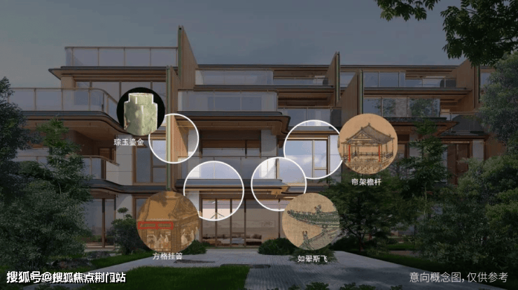 将故宫博物院收藏的《四季山水图》避风䈋装饰构件提炼出来,镶嵌在立面上,完美展示古典张力和现代艺术气质。