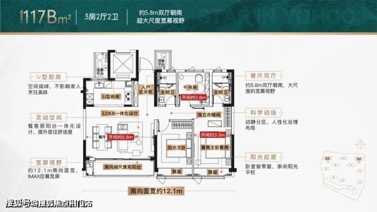 LDKB通透格局,U型厨房,畅享宽敞餐厨空间;