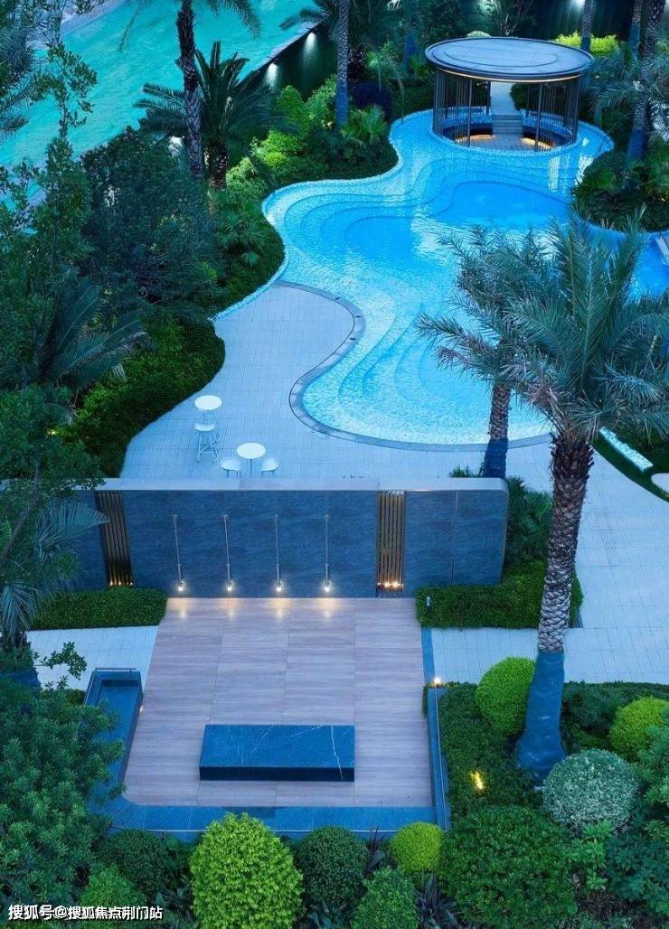已经实景呈现的蒂芙尼蓝中心戏水池,水池边一道道弧形曲线,池底精致的马赛克拼花,透着满满的热带度假风,在配上水池旁挺拔的银海枣等热带植物,未来业主们往水池边一趟,仿佛就置身在东南亚的海滩边的高级度假酒店。