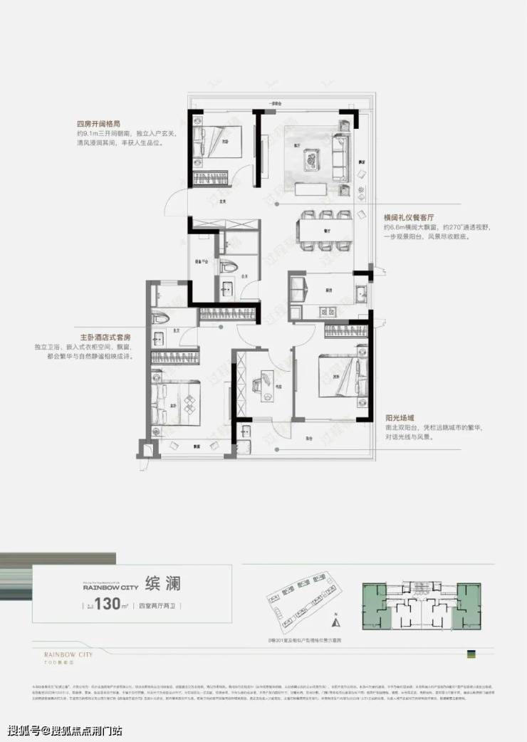 130㎡四房边厅: 270°全景飘窗:边套户型三面采光,客厅开间达6.6米,朋友聚会不憋屈;