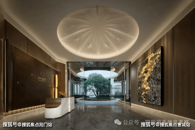 步入门庭,映入眼帘的是由11根高5米多的弧形立柱构成的壮阔空间。这些立柱巧妙环绕,撑起了一个宏伟的藻井,其吊顶采用了精致的透光云石,彰显非凡的气派与匠心独运的设计。中心一棵古桂挺拔繁茂,恭候业主荣耀归府。