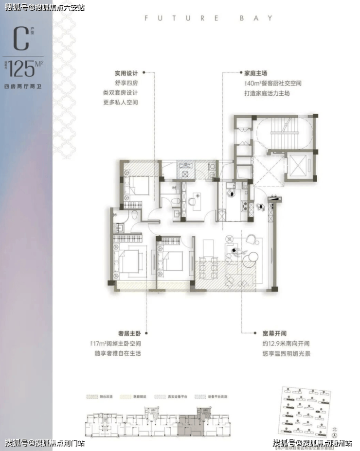 建面约125㎡户型:四房两厅两卫:南北通透,类“一户一梯”设计,增强了归属感与私密性,入户空间可安置童车、鞋柜等。该户型是小面积真边套四房,卧室面宽尺度优越,四开间朝南,约12.9米南向面宽,南向大横厅开间约6.4米,餐客厅面积约40㎡。