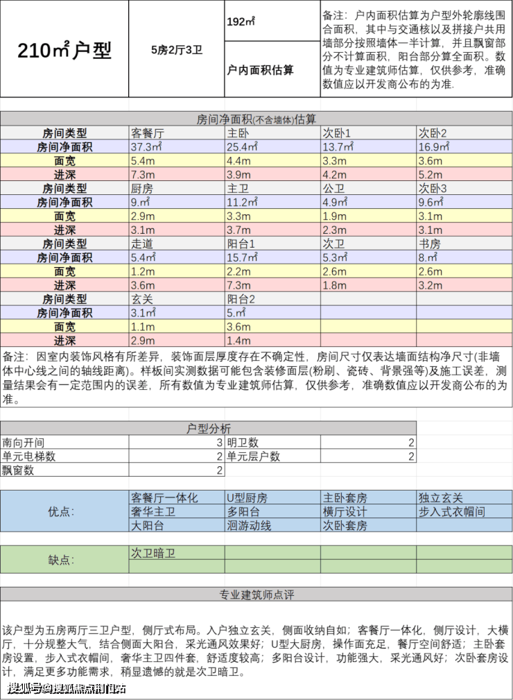 一、建面约210方五房两厅三卫: