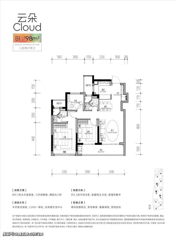 建面约98㎡边套也是板块内首创,这个面积段的户型,通常是更大户型挤压下的边角料,而眼前这一套,却是全明边套。