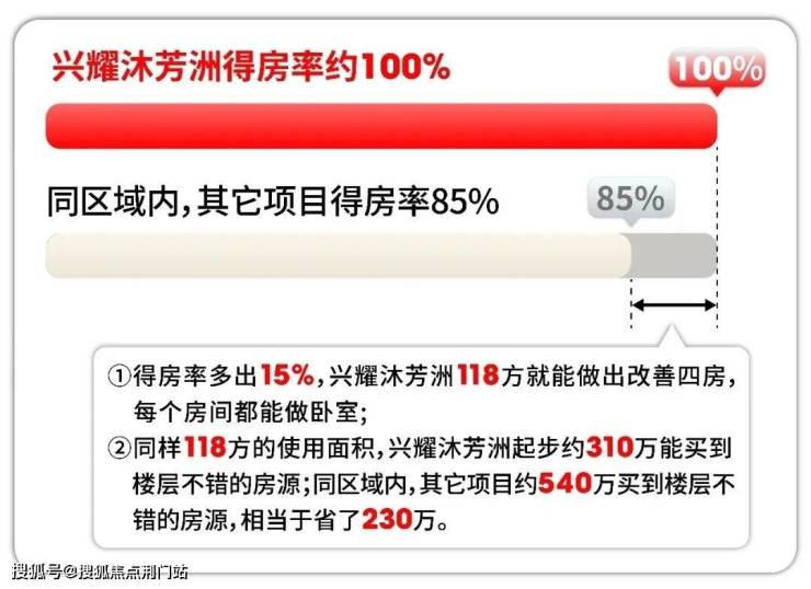 以一般项目得房率平均90%来算,兴耀沐芳洲约100%的得房率,同样百平米户型,兴耀沐芳洲比其它项目多出10个平方,相当于一间卧室;要是换算成房款,直接省下25-30万!相当于花同样的钱,买更大的空间,性价比直接拉到顶!