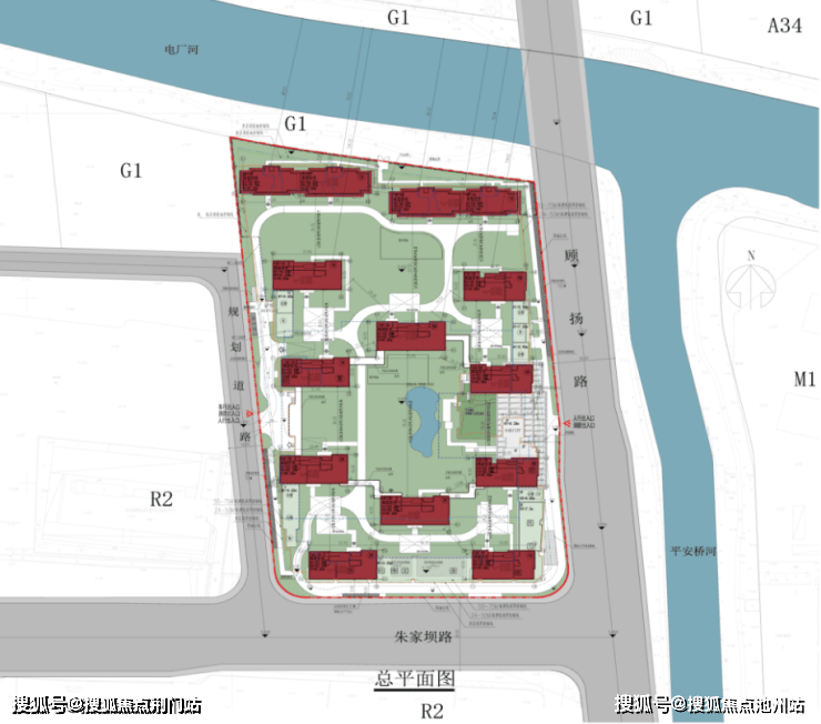 其中洋房位于项目的北面,享受一线电厂河道景观,整体南高北低分布。项目的出入口位于东面的顾杨路和西面的规划道路。其中东面的主要出入口位置坐了小区门厅、景观构架、下沉式庭院和景观水系,详细的方案效果待二次深化。