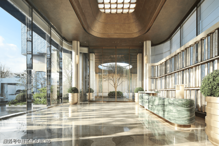 主入口大门高度达到了约7米,置身其中,尊贵气派。选用贝金米黄石材、维多利亚绿与白雪公主奢石,搭配古铜色金属板,巧妙融合冷暖色调,营造出极具张力的美学效果。