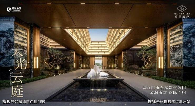 入口两侧,“翠谷幽兰”奢石静静矗立,搭配上一座别具气场的雕塑,每一处细节都彰显着不凡的格调。