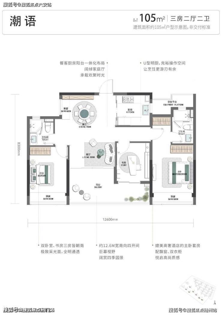 建筑面积约105㎡实现四开间朝南,约12.6米南向面宽,主次卧类双套房设计,颠覆市场对空间尺度的想象边界。