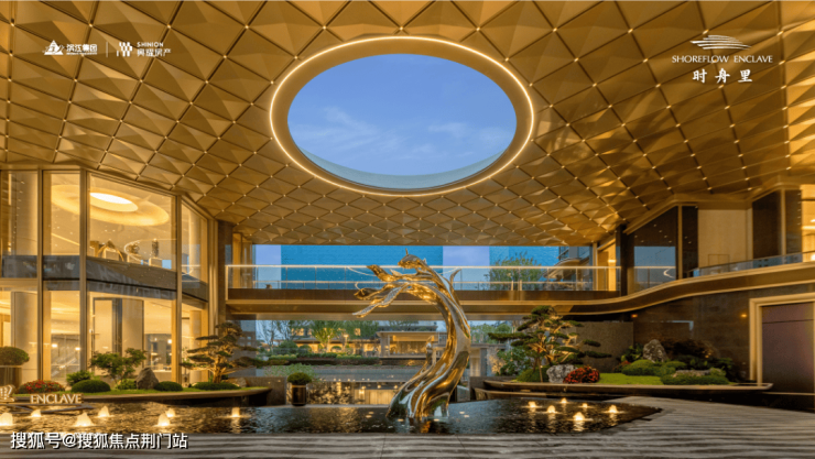 GAD大师张微以“科技+生态”为设计理念,将未来感弧线融入城市肌理:70米宽、9米高的鎏金天幕入口采用偏置大堂设计,顶部圆形镂空让光线穿透,将社区立体花园与城市界面自然衔接,形成“你站在桥上看风景”的互动美学。