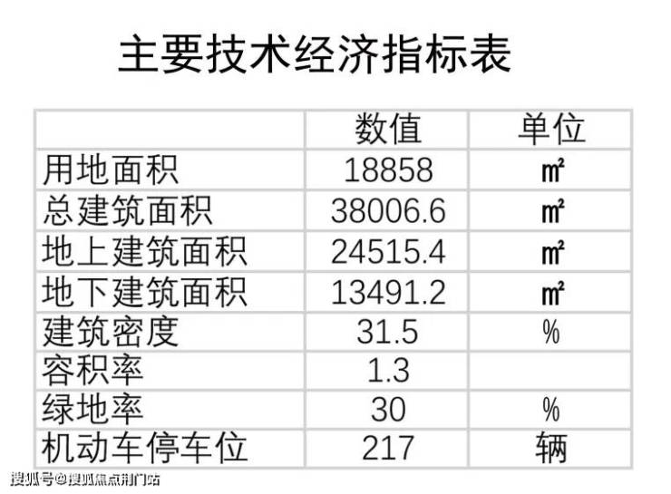 地块用地面积18858㎡,总建筑面积38006.6㎡,地上建筑面积24515.4㎡,地下建筑面积13491.2㎡,建筑密度31.5%,容积率1.3,绿地率30%,机动车停车位217辆。